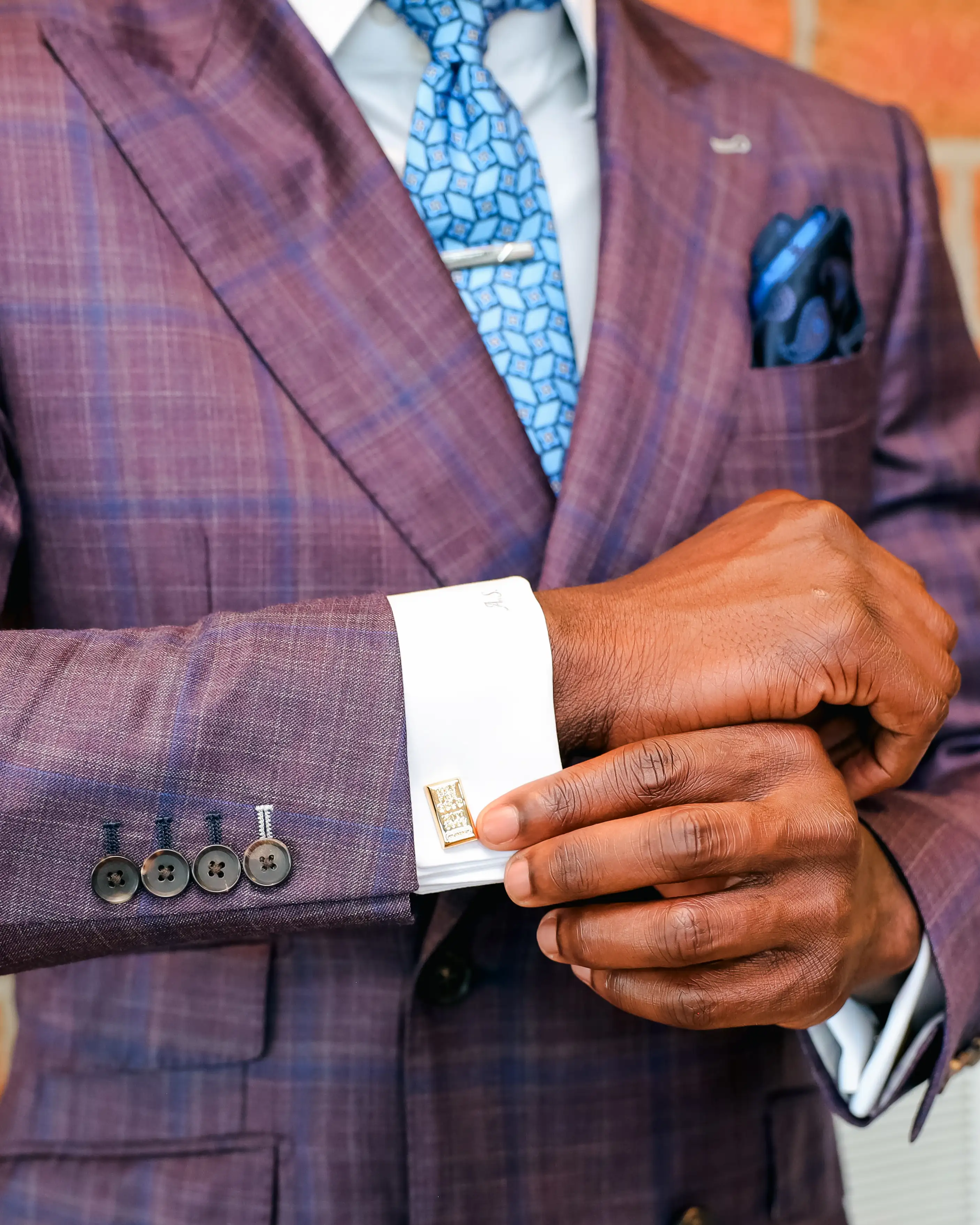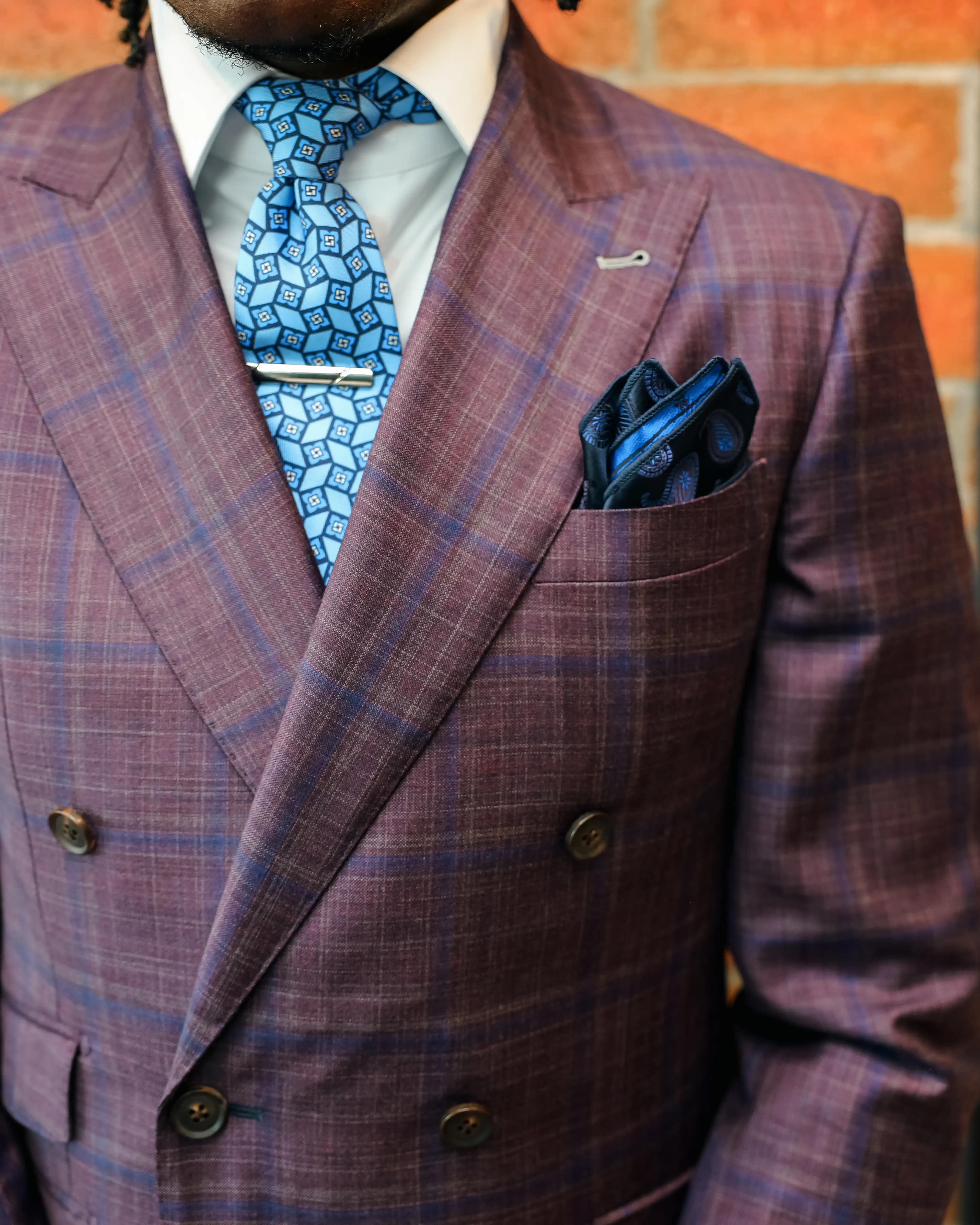 The final look embodies elevated confidence—bold yet sophisticated. The deep burgundy tone commands attention while the navy windowpane keeps the design timeless and refined. With the Italian silk tie and coordinated pocket square completing the ensemble, Adon’s look represents the intersection of athletic excellence and elevated style.
