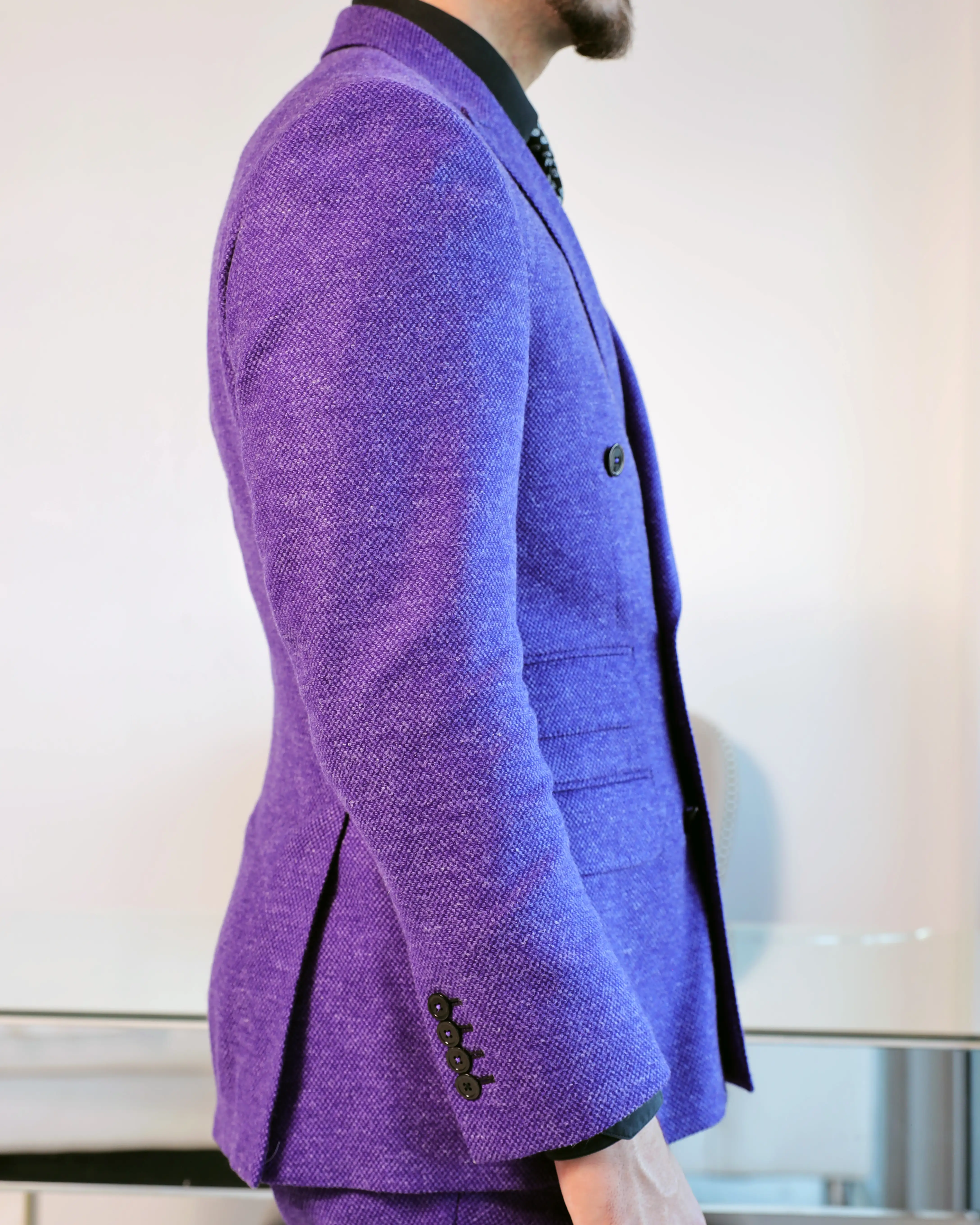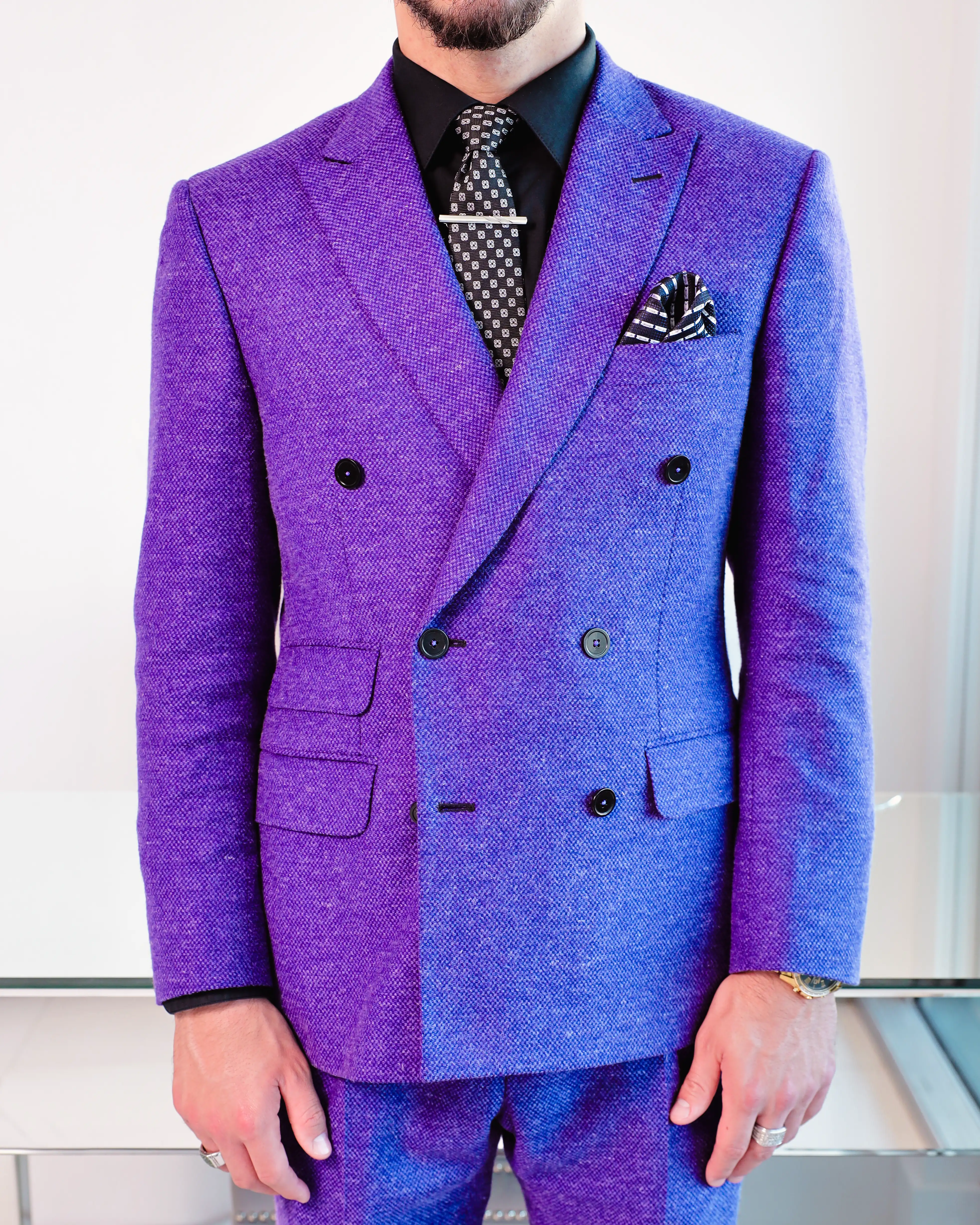 This project focused on designing Michael DiPreta’s first bespoke Maison Élevée suit—a defining moment in the evolution of his professional identity. As a speaker and mentor within the rapidly growing cryptocurrency industry, Michael required a look that conveyed both innovation and authority. The result was a bold purple double-breasted suit made from premium Dormeuil natural fibers, combining classic tailoring with forward-thinking style. The garment was engineered to elevate his presence in networking environments, speaking engagements, and leadership settings.