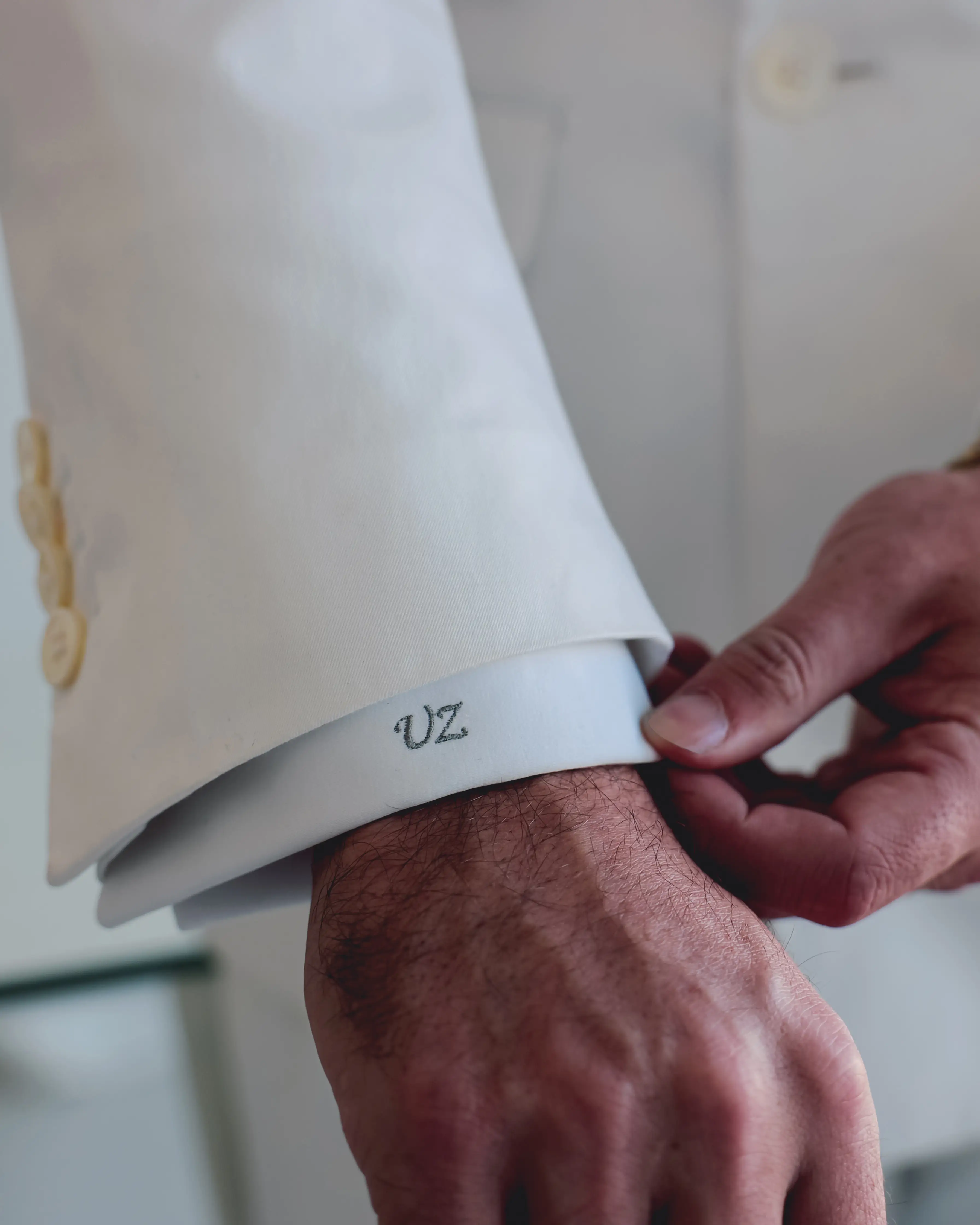 We paired the suit with a crisp white French cuff dress shirt, embroidered with “U.Z.” on the interior cuff—subtle but deeply personal. The accessories—signature cufflinks, a luxurious tie, and a carefully matched pocket square—completed the look with masterful harmony. Every detail was custom-built for power: the fit, the lapel shape, the monogram, the lining, the layering. This is not a suit—it’s an identity.